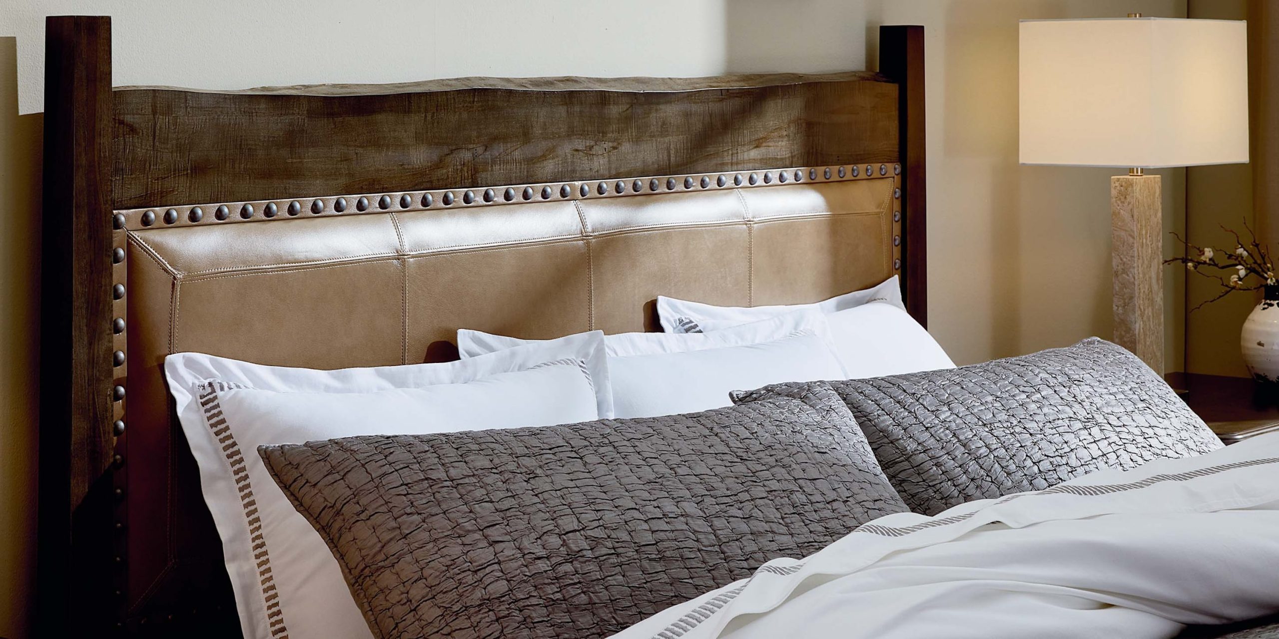 The biophilic live edge design of our Heritage Live Edge Leather Upholstered Bed is uniquely enhanced when styled with an upholstered leather panel. Combining exquisite natural elements like homegrown maple hardwood and luxurious leather brings to your bedroom the healing quality of connection with our natural environment. At the same time, you’re creating a custom piece of heirloom furniture. Start by choosing from one of our select finish colors that we’ll apply in a multi-step process to enhance the natural wood grain. Then select a fine Bassett leather for your upholstered panel, adding details like nailhead trim to suit your design plan. Select low or high posts on a Queen, King, or California King frame, or opt for a headboard only. A BenchMade custom bed like the Heritage will become your special treasure, ready to set the stage for a lifetime of pleasant dreams.
