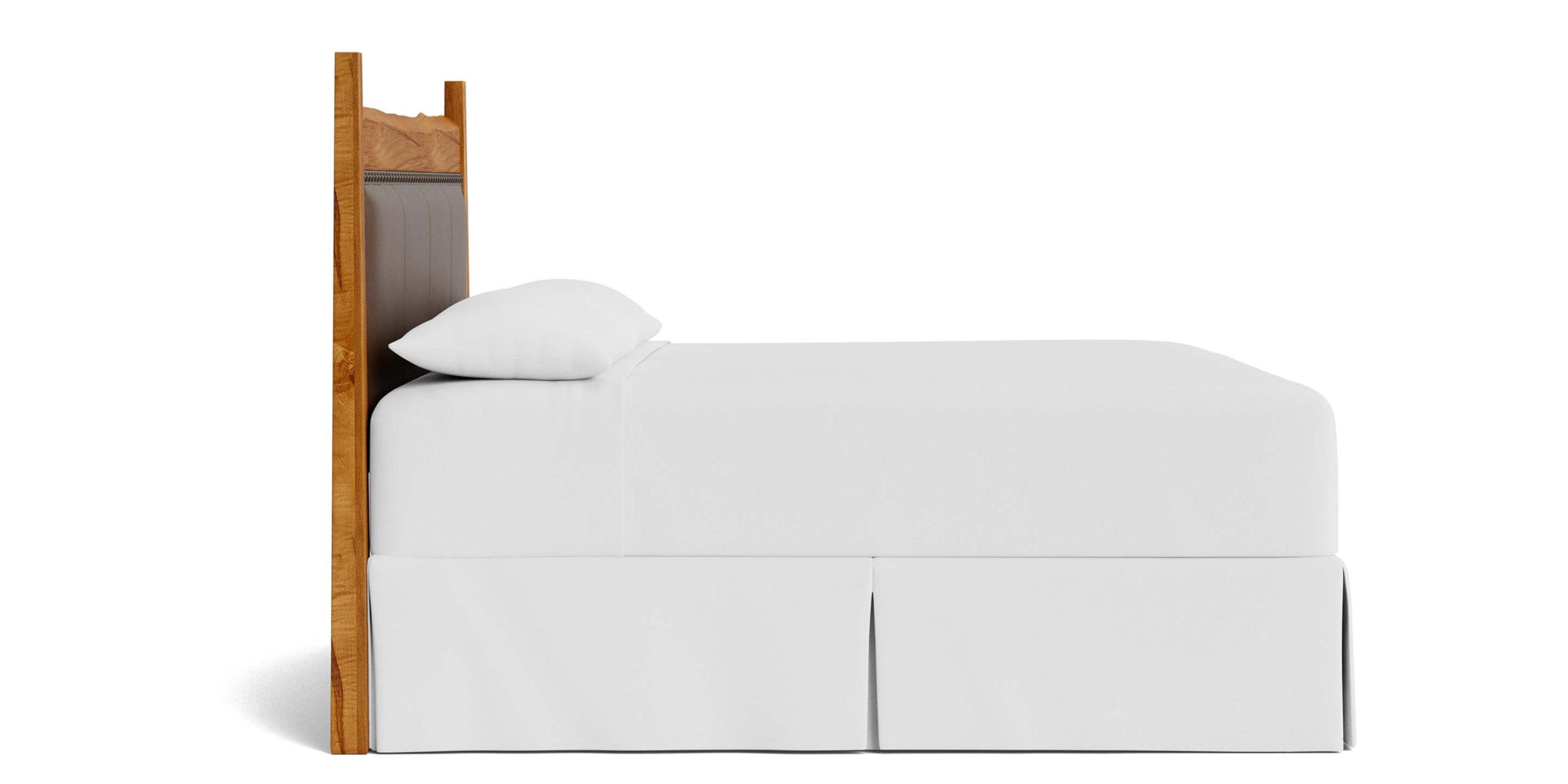 The biophilic live edge design of our Heritage Live Edge Leather Upholstered Bed is uniquely enhanced when styled with an upholstered leather panel. Combining exquisite natural elements like homegrown maple hardwood and luxurious leather brings to your bedroom the healing quality of connection with our natural environment. At the same time, you’re creating a custom piece of heirloom furniture. Start by choosing from one of our select finish colors that we’ll apply in a multi-step process to enhance the natural wood grain. Then select a fine Bassett leather for your upholstered panel, adding details like nailhead trim to suit your design plan. Select low or high posts on a Queen, King, or California King frame, or opt for a headboard only. A BenchMade custom bed like the Heritage will become your special treasure, ready to set the stage for a lifetime of pleasant dreams.