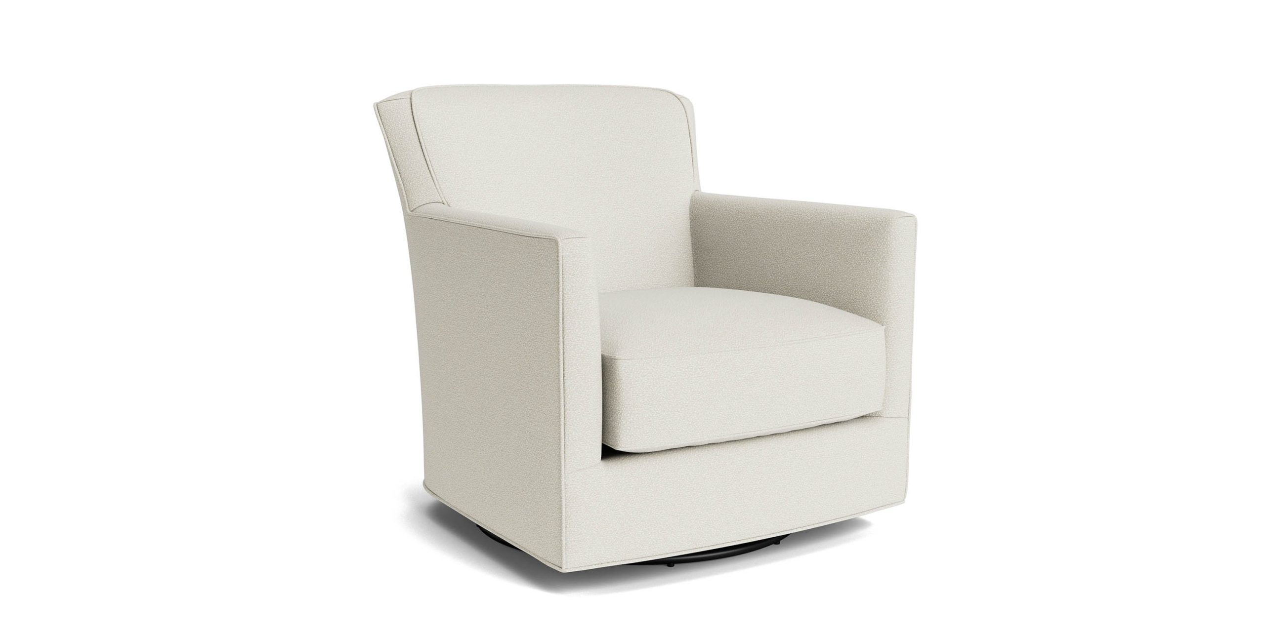 Enjoy both simple, sophisticated beauty and fine design in motion! Ease back in perfect relaxation with this New American Living Thin Track Arm Swivel Glider Chair by Bassett Furniture. Perfect for many lifestyles in a sitting room, bedroom, living room, den, or nursery. This comfy swivel glider features a padded back and a boxed, welted seat cushion. Also available in leather.
