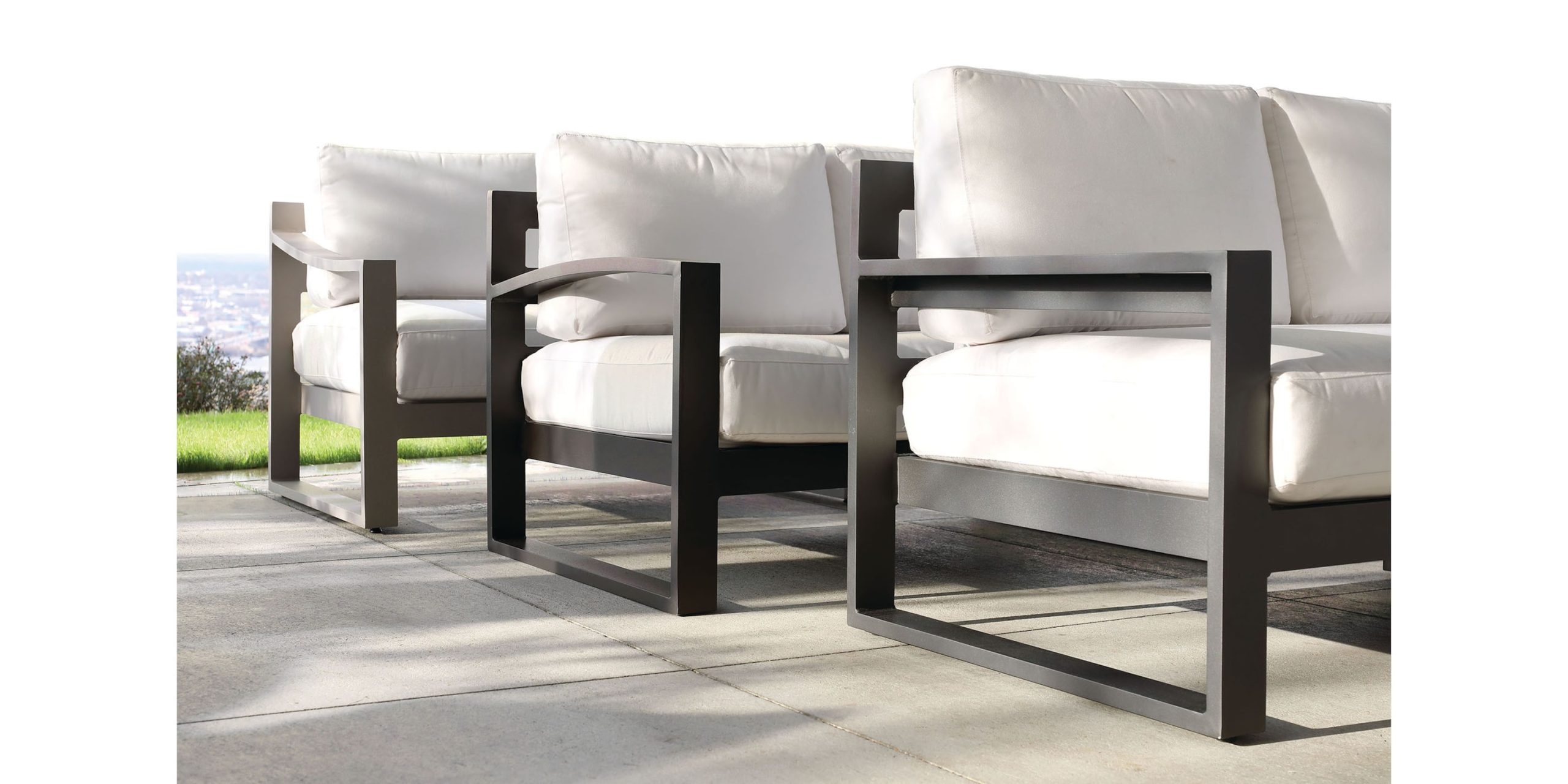 Comfort first always in the Bonavista 3 piece Sectional. From neighbors and family coming together to kicking up your feet with furry friends, the L shaped sectional welcomes all. Featuring a track arm for a sleek contemporary look, make it your own with choice of color in durable Sunbrella fabrics and frame, all made in the USA. Also available with Slope Arm and Arched Arm styles.